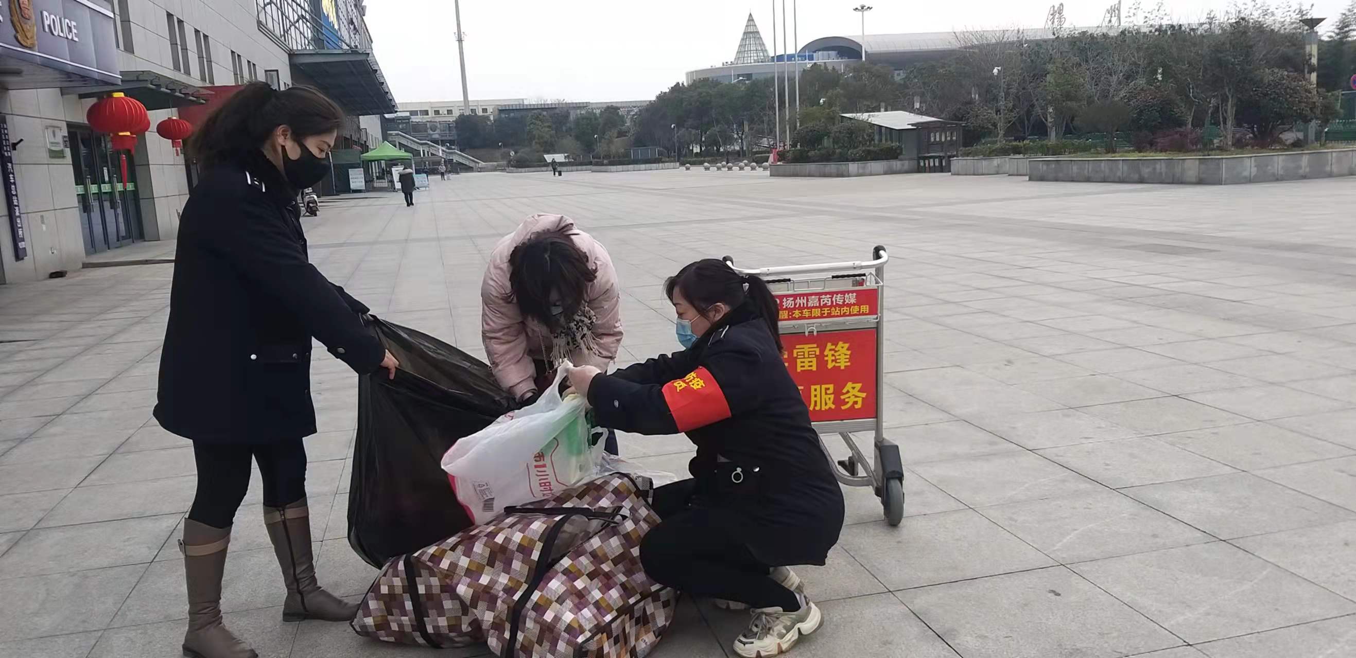 1月29日下午4點(diǎn)時(shí)分,西部客運(yùn)樞紐揚(yáng)州汽車站務(wù)中心工作人員殷丹和薛揚(yáng),日常工作巡查時(shí),在站前廣場(chǎng)進(jìn)口處,看到一名旅客蹲在地上,手里抱著散落一地的行李無計(jì)可施,焦急萬分。