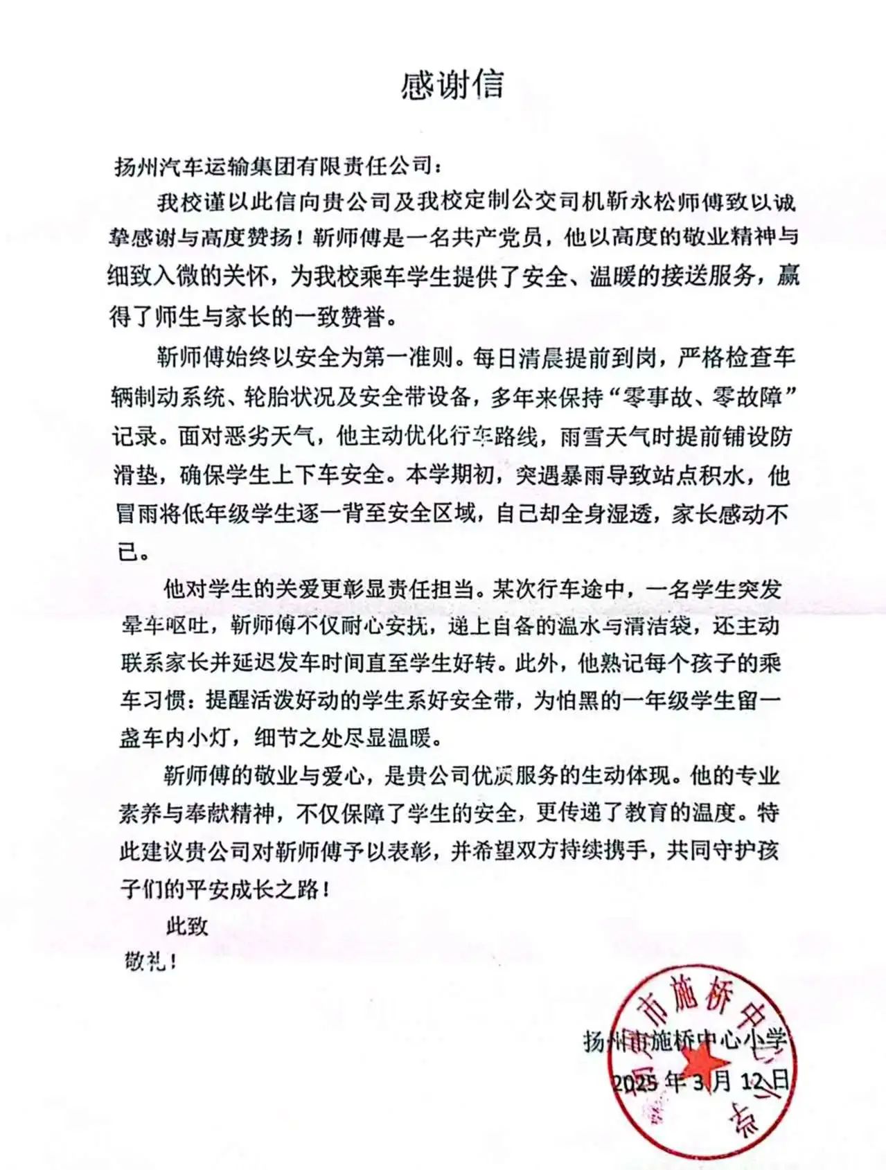 近日,揚(yáng)汽集團(tuán)營(yíng)銷中心收到來自揚(yáng)州市施橋中心小學(xué)的感謝信,對(duì)校車司機(jī)靳永松師傅盡職盡責(zé)的安全護(hù)送服務(wù)以及對(duì)學(xué)生們的悉心照顧表示衷心的感謝。